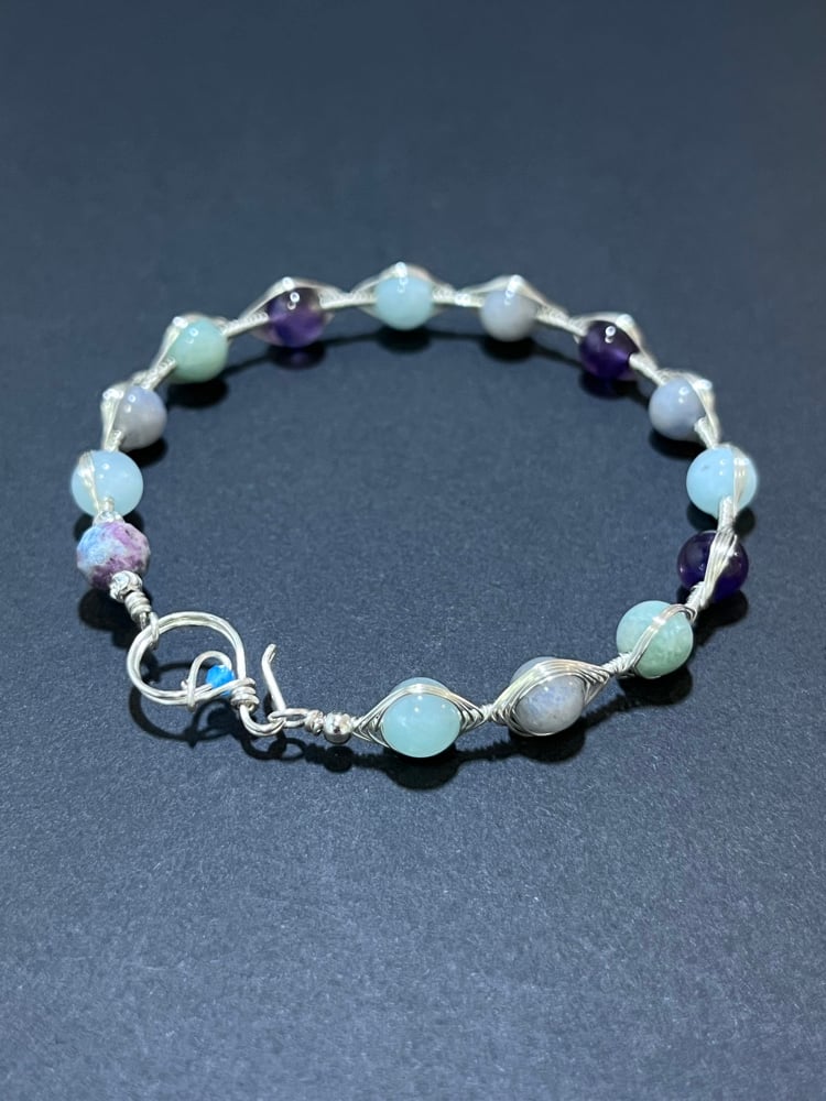 This fully handmade metal wire-wrapped bracelet, featuring an array of natural gemstones, including Amethyst, Amazonite, Aquamarine, Angelite, Ruby and Sapphire, and Blue Apatite. Specially curated in blue-green tones, it evokes a serene ocean-like ambiance, with each bead hand-selected and wrapped to showcase unique luster and energy flow.