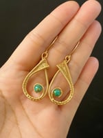 🌷 This pair of handmade metal wire-wrapped earrings features delicate gold wire outlining elegant curves like peacock feathers, with a natural Chrysocolla bead inlaid in the center, resembling wings gently spreading.
