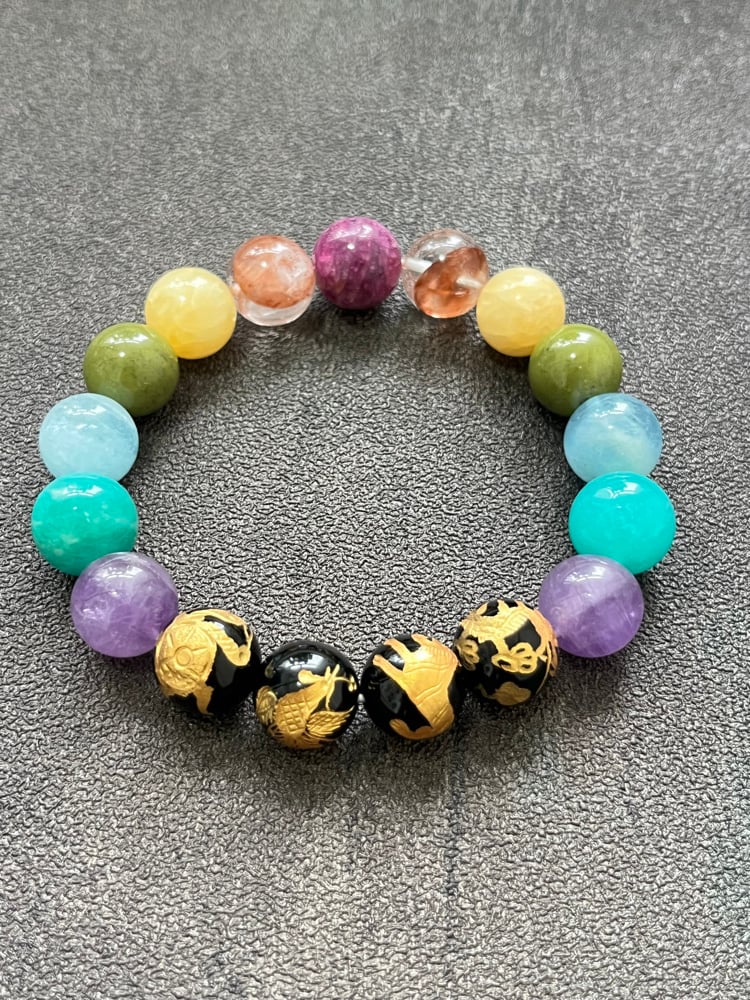 💫 This handcrafted bracelet features gold-carved Four Divine Beasts paired with black onyx, complemented by a seven-chakra color design. Its purpose is to offer wearers comprehensive protection while fostering balance, health, and harmony of body, mind, and spirit.