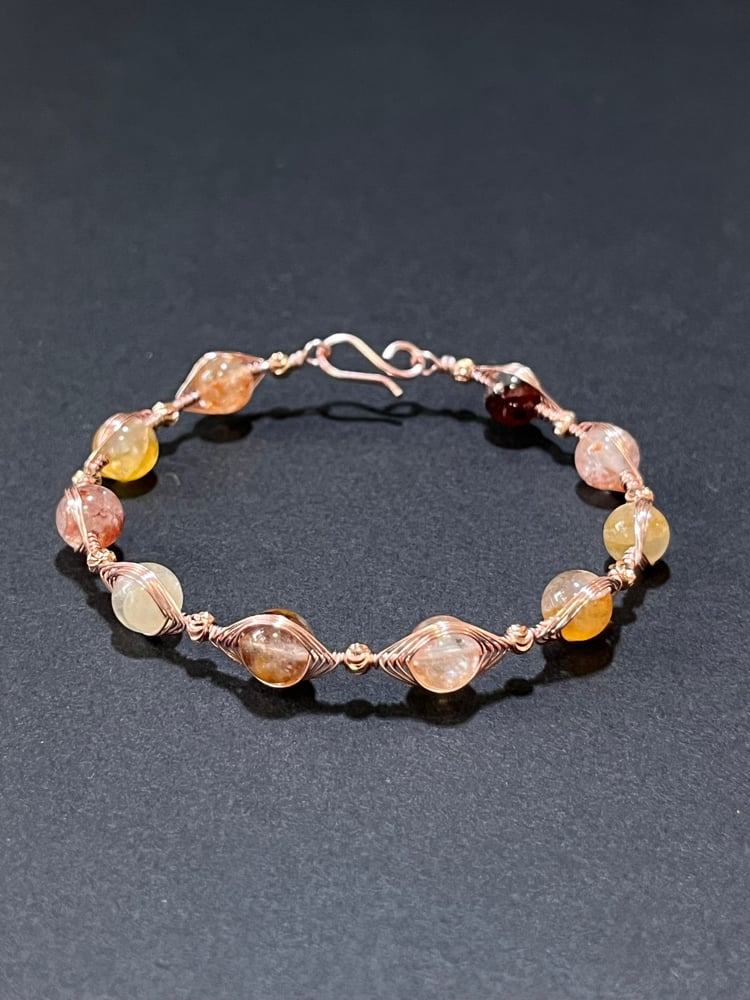 🧚🏻♀️ This fully handmade bracelet is intricately crafted with delicate metal wire, where each hematoid quartz crystal blooms like a tiny flower within its core, gently held and arranged in a scattered circle. The fusion of red, orange, and yellow within the stones reflects nature’s lively elegance under light, like a floral language adorning your wrist.