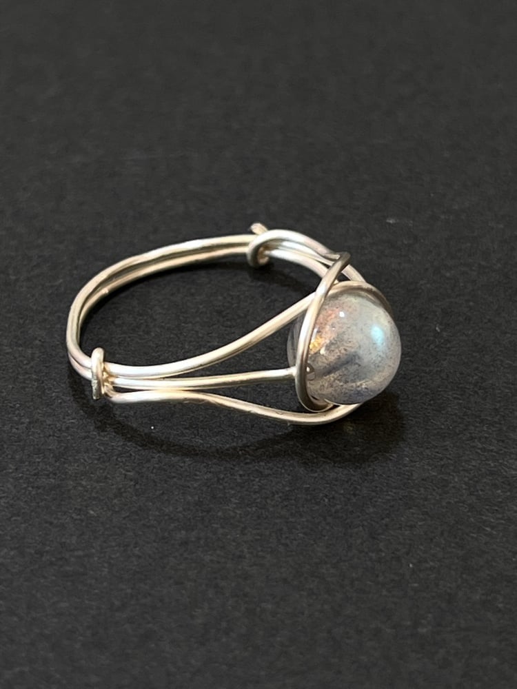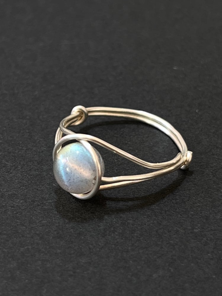 💫 This handmade metal wire-wrapped ring features a delicately woven silver thread encircling a natural Labradorite bead as its core, crafted with a minimalist three-wire interwoven structure to securely hold the stone, symbolizing protection and transformation. The bead can rotate flexibly, allowing light and shadow to dance on your finger, awakening the wearer’s hidden inner strength, like a whispered secret from the earth.